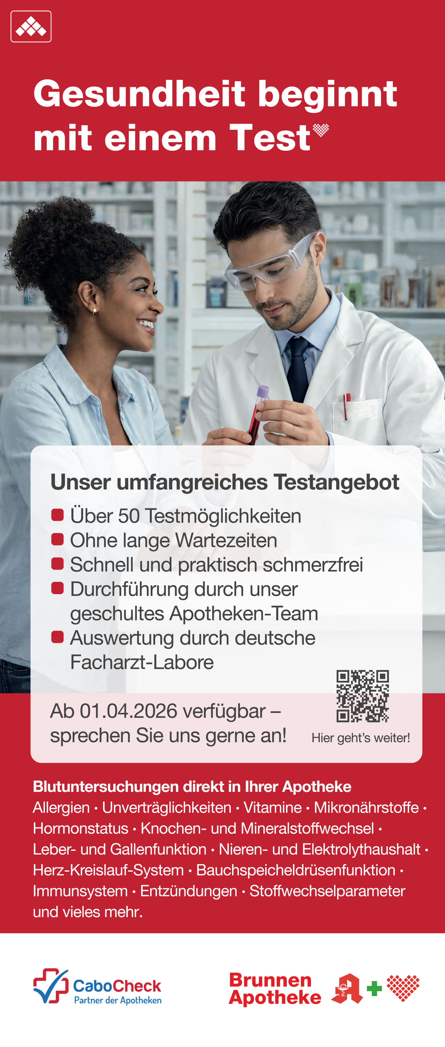In der Brunnen Apotheke Rosbach erwartet Sie eine große Auswahl moderner Blutanalysen– individuell, diskret und wissenschaftlich fundiert.